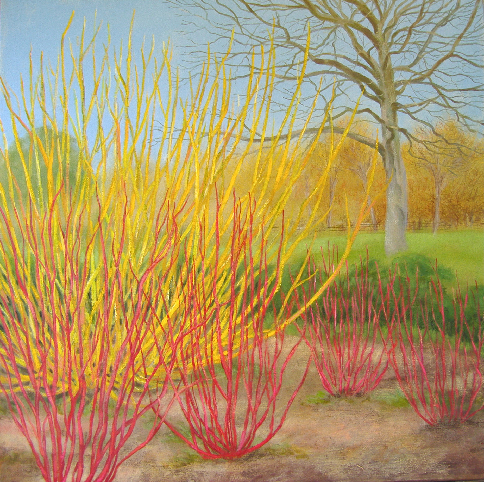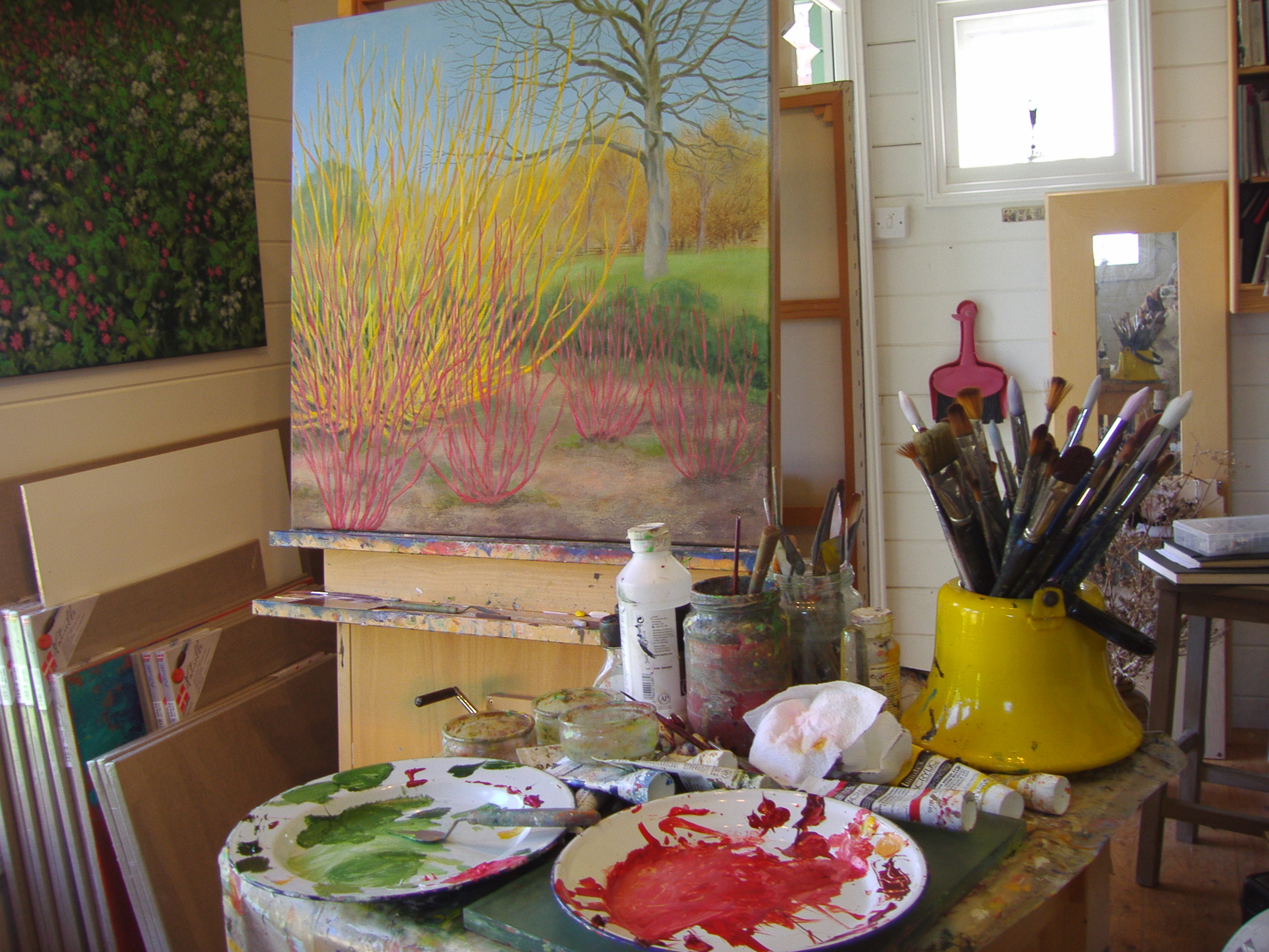 Got into the studio at 6 this morning and so far have done about 4 hours with a short break for breakfast. With this painting I am trying a new technique using oil pastels on top of acrylic paint and so far I’m enjoying it and will use it again. The winter garden at Hotham is a real gem having its glory time when everything else is dormant. Then it comes into its own with willows, dogwoods and lovely white brambles doing their winter thing.