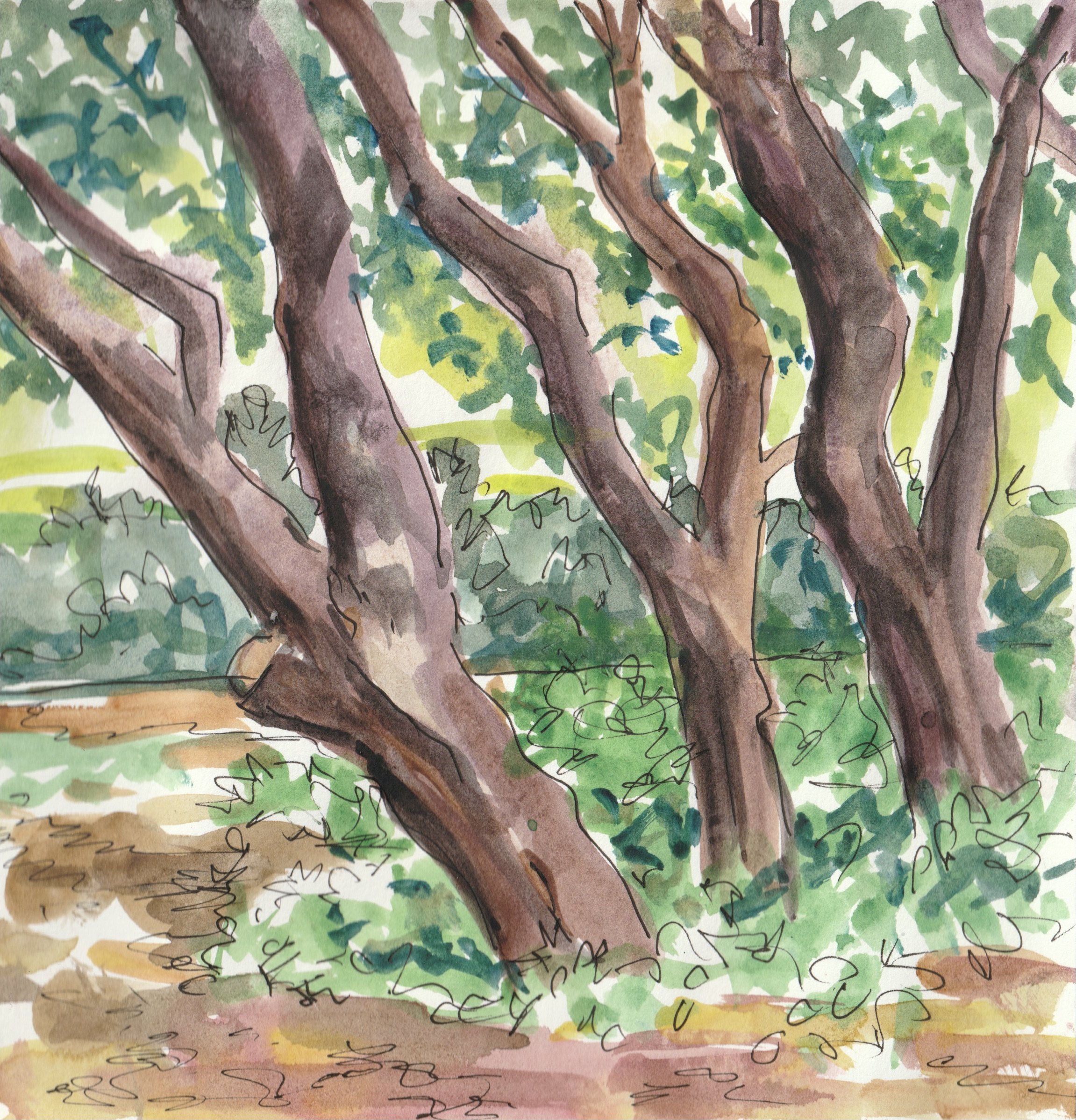Sketching group today. Travelled light with my little field box of watercolours and sat in my favourite tree grove sloshing away. Trouble with watercolour is that it really cares about having the right paper (because its worth it)and can quickly descend into a muddy mess, it also helps if you don’t upset half the contents of your water reservoir on it, wet on wet is one thing but wet on a flood is quite another. You watercolour experts have my full permission to fall about laughing. As usual I ended up with pen and wash, emphasis being on the wash!